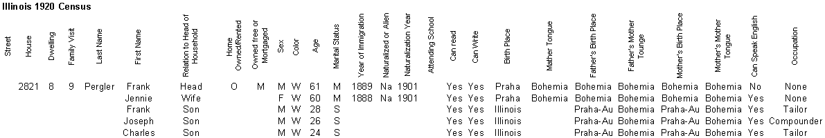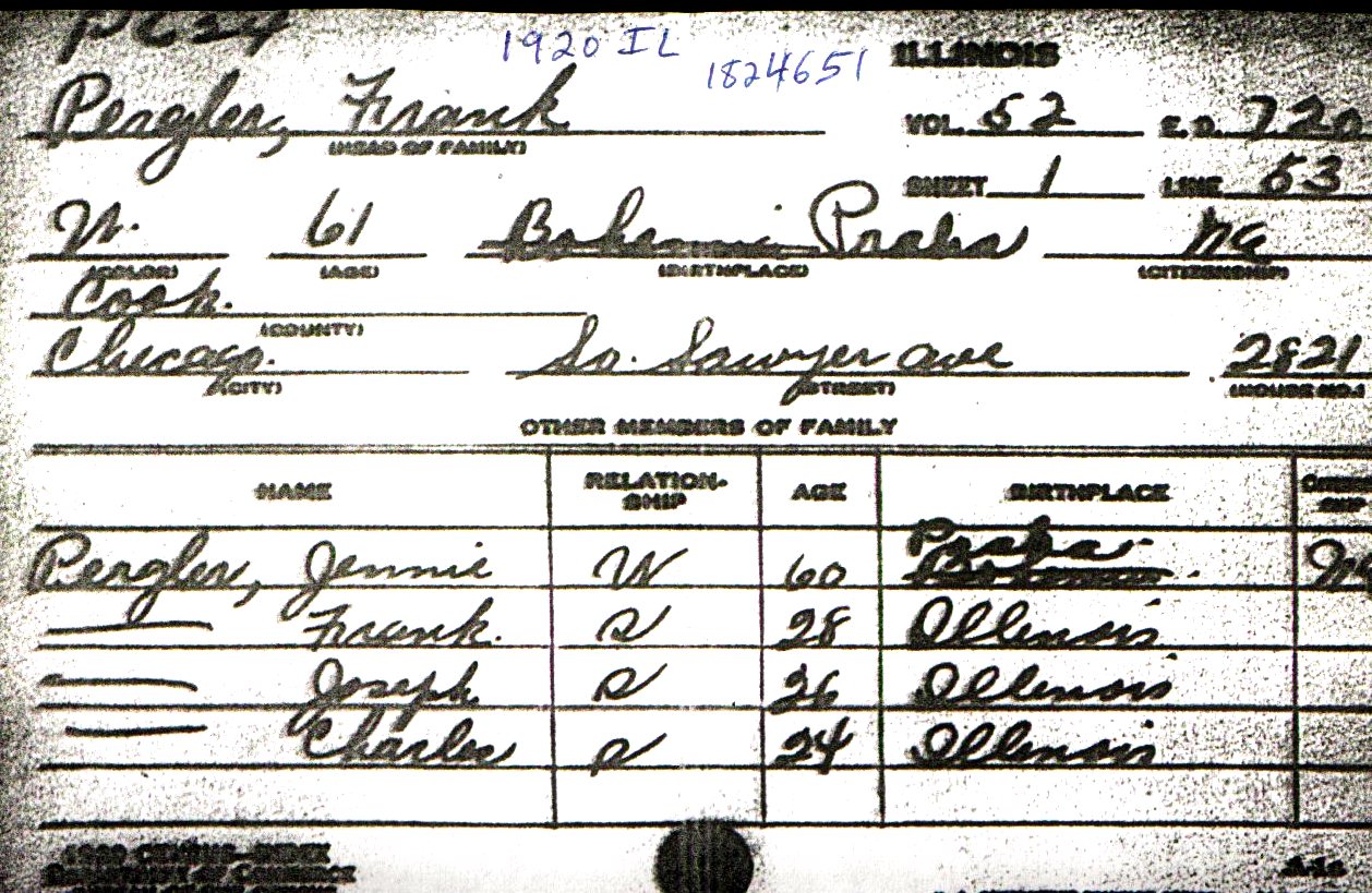 - Frank Pergler died 1 Jan 1921 in Chicago, Cook, Illinois at the age of ~55 - born about 1866 in Bohemia (based on this age)