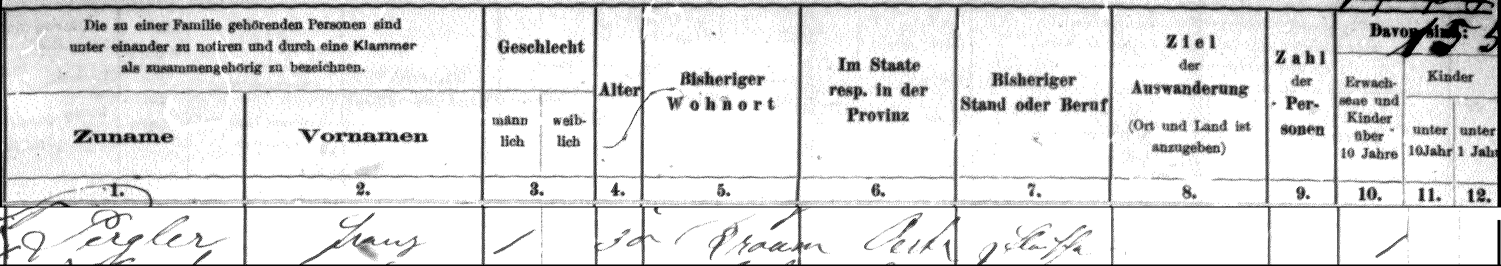 Franz Pergler - Immigrated 17/Nov/1889 to New York from Braum, Oesterich (Austria) at the age of 30 on the Ship Rugia (Danish Flag), Captain Kartawa. Franz's Profeesion was Fla..scha..