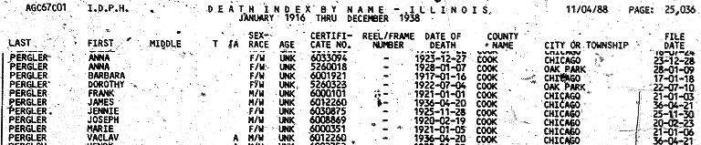 - Frank Pergler died 1 Jan 1921 in Chicago, Cook, Illinois at the age of ~55 - born about 1866 in Bohemia (based on this age)
