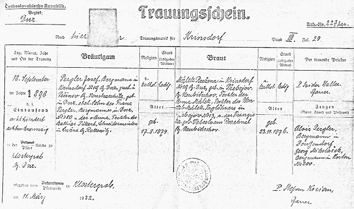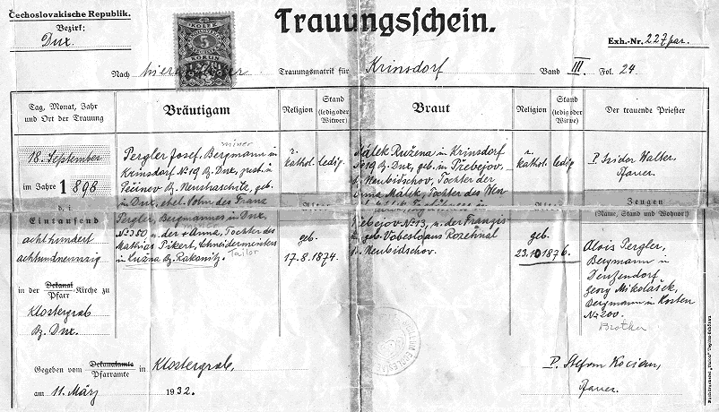 - Marriage Certificate for Josef Pergler & Ruzena Malekova